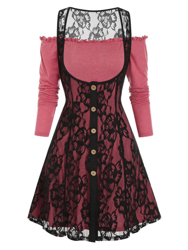 Cold Shoulder Mock Button Overlay Lace Two Piece Dress