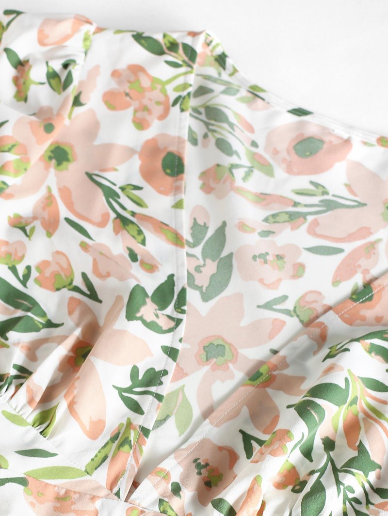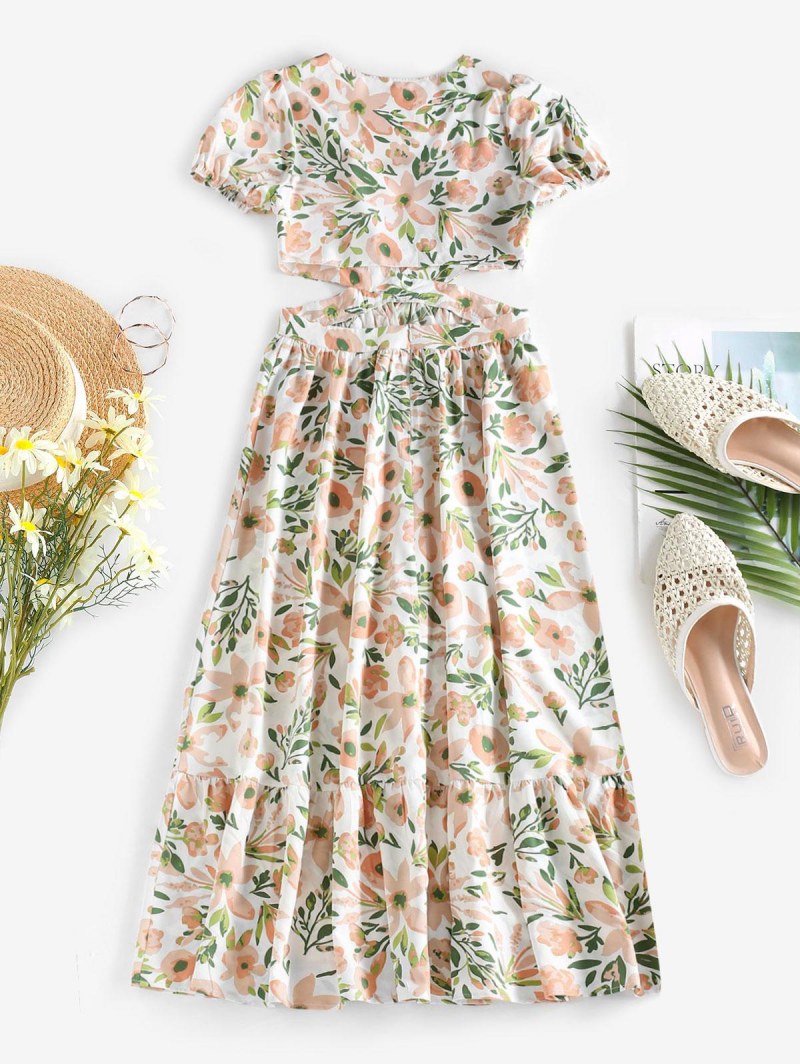Puff Sleeve Flower Cutout Flounce Midi Dress